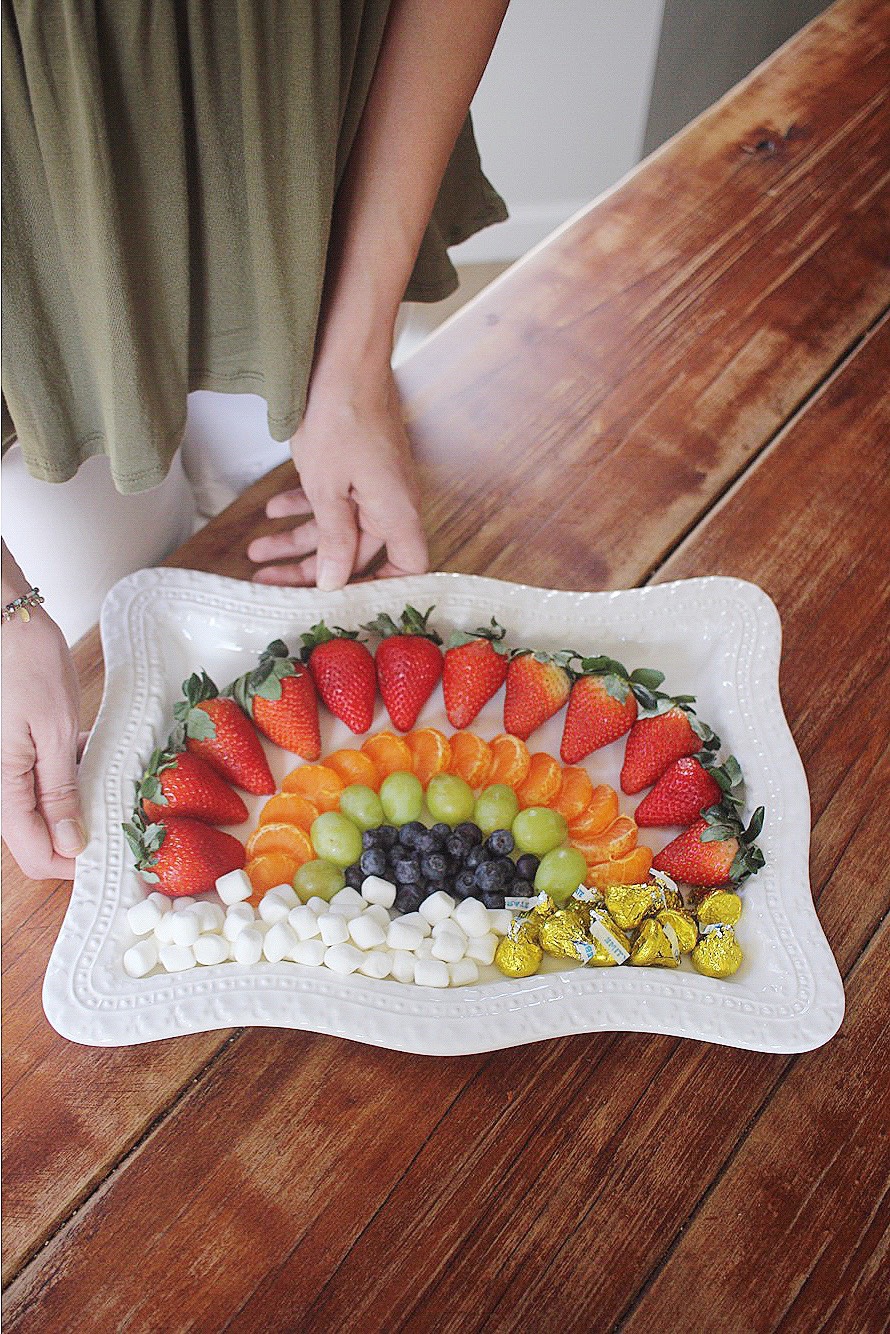Just in time for St. Patrick’s Day, I wanted to share this simple + pretty rainbow fruit plate idea with you in case you’re planning to get festive! The cute gold-foil Hershey’s Kisses as the pot of gold are my favorite 🙂