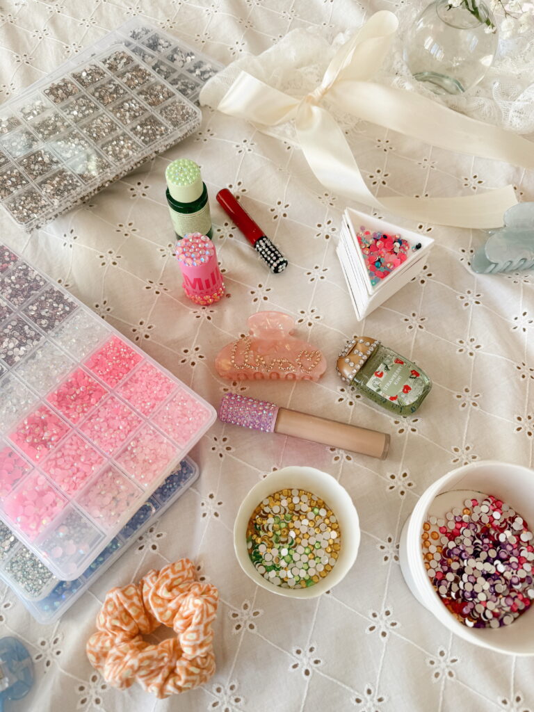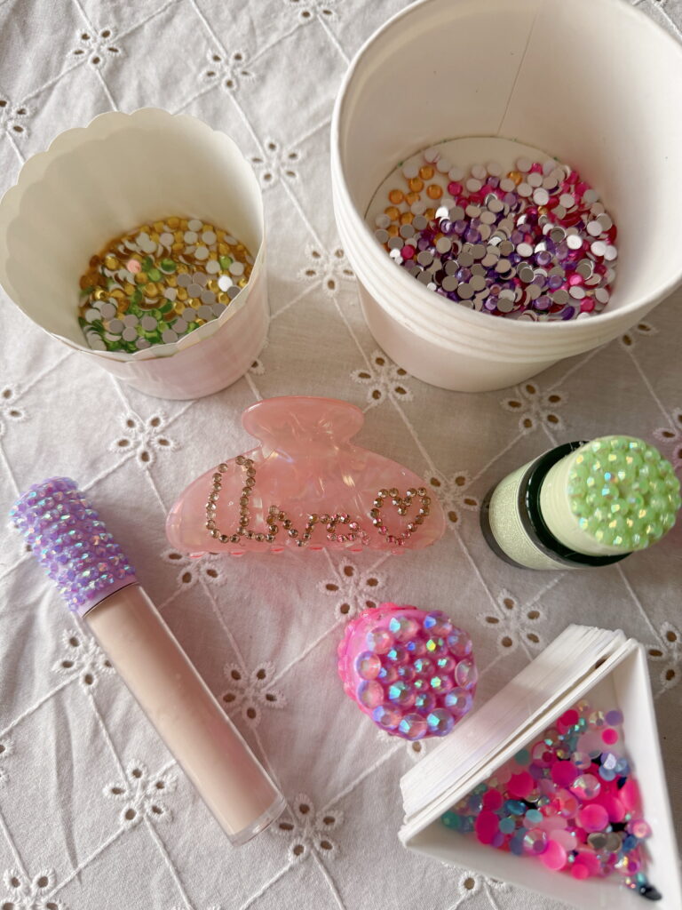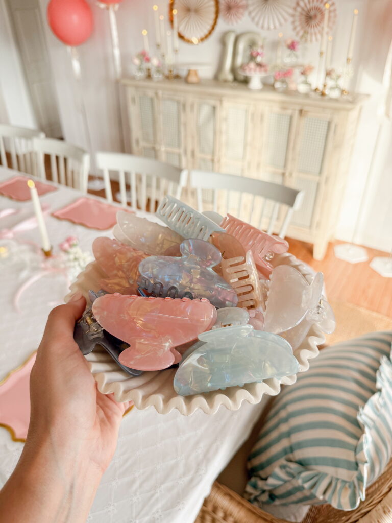 Today’s post is all about Ava’s bedazzling birthday party!!! We had the best time celebrating our 10 year old with a coquette-themed party where the girls bedazzled hair clips + makeup products!